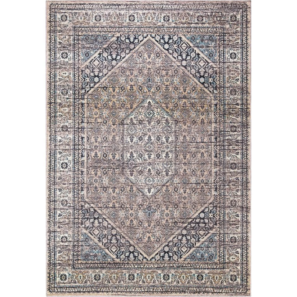 A geometric pattern featured in a vintage inspired rug creating a rustic appeal. This rug features a soft brown color in addition to other earth tones. The rug is inspired by oriental rugs and features a large hexagon medallion with an ornate border. It’s colors include tinted rich browns, honey, gold, and creams, purposefully distressed to create a warm and rustic vibe.