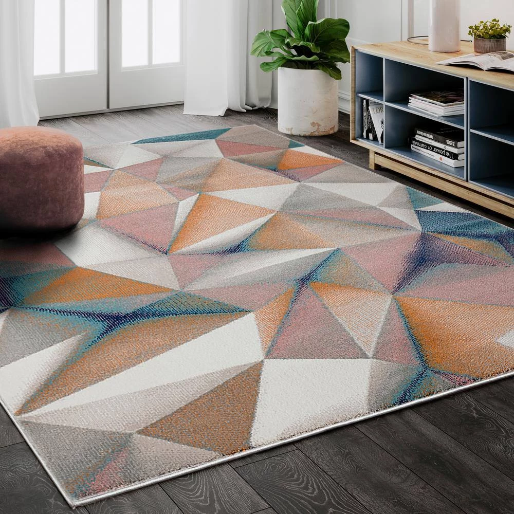 Add geometrical interest to your room decor with this statement rug. Featuring a modern abstract 3D design paired with fresh colors of beige, corals and blues create the perfect blend of up to date fashion trends that will also stand the test of time. This unique rug shows off your sense of style, allowing it to be a focal point in your decor while bringing together an entire room. Perfect for the home or office, if you are looking for a hardwearing rug that looks fabulous too then this rug is perfect. Made from polypropylene yarn and power-loomed it is stain resistant, easy to clean and doesn’t fray either.