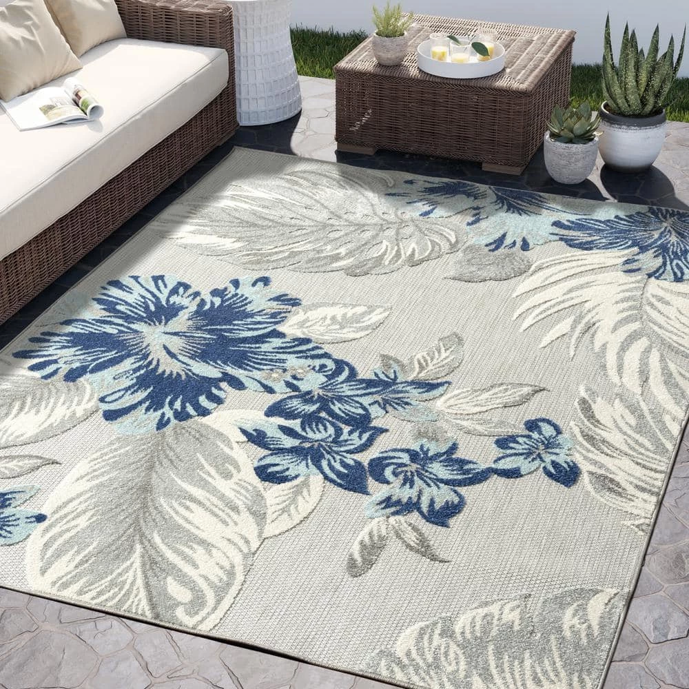 Take a trip to a tropical oasis without ever leaving your home with this Hampton area rug. Created with contemporary design in mind, this area rug features a modern white palm print with a lush, blue flower. Though the colors are unexpected, they still offer a breath of tropical, refreshing air. Add all of the ease and luxury of a luxury holiday to your own space with this simple aesthetic. Though understated, the easy-care fabric and durability speak for themselves.