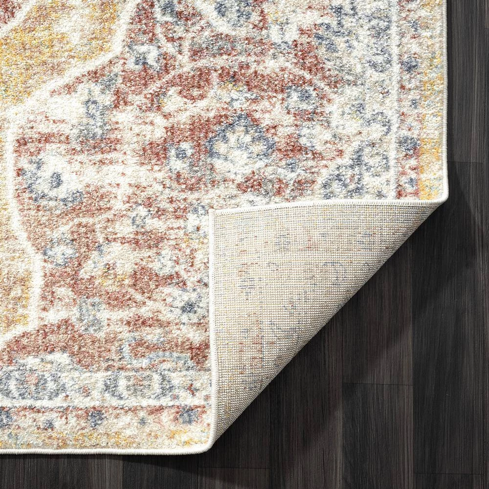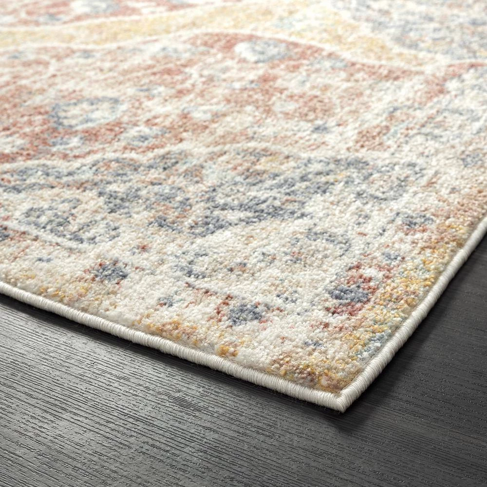 For a traditional favorite, choose this area rug for your space. Though simple, this rug proves that more remains to be discovered within the details. The beige background color and border might be simple, but it perfectly balances the splash of warm color placed throughout. The warm blue and burnt orange offer dimension within the floral and medallion design, but they won’t overpower your existing design aesthetic. Welcome warm, sophisticated charm into your home with this easy-care rug.