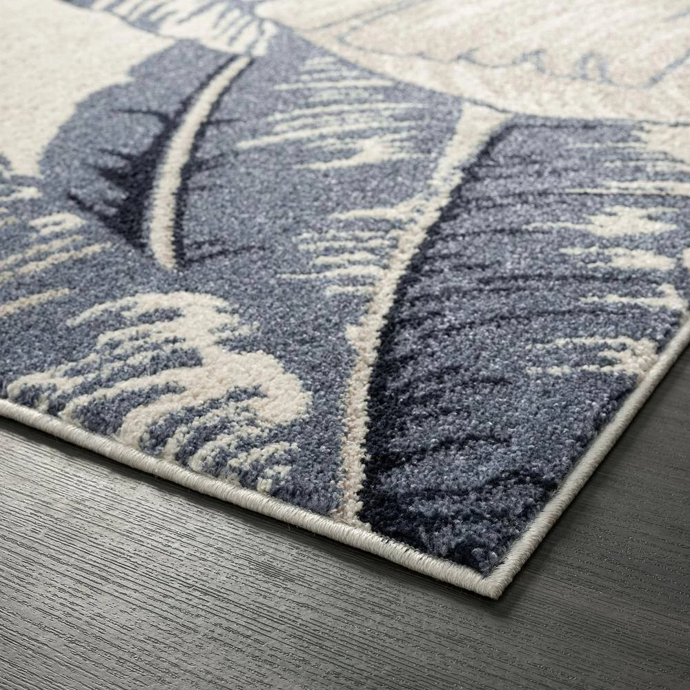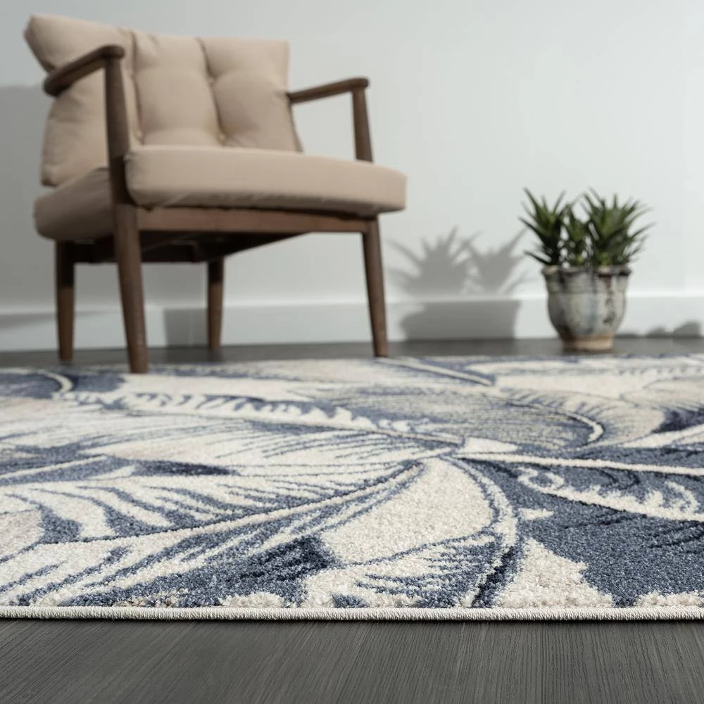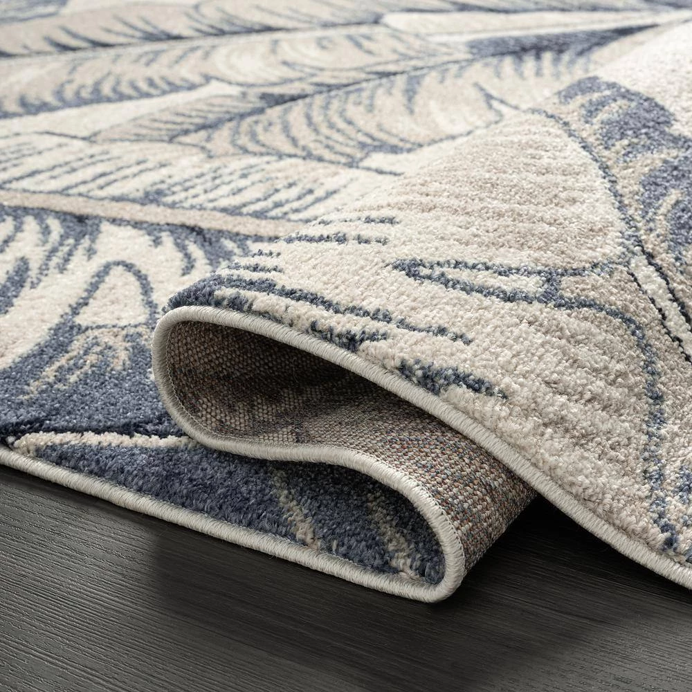 A monochromatic tropical rug with tones of blues, beiges, greiges. The popular banana leaf is portrayed on this rug design creating an elegant tropical design to suit contemporary and transitional room decors. The leaves are woven in a tasteful manner to create a chic rug helping bring the outdoors inside.