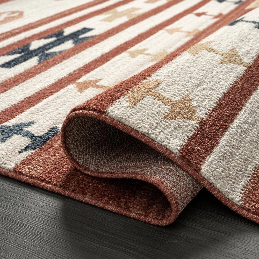 A classic tribal design inspired by Southwestern colors and geometric patterns. This Southwestern inspired area rug brings together earth’s rust colors with a blend of beiges and creams. Tribal geometric shapes in teal, yellow and orange adorn the rug. The versatile design of the rug offers the possibility of pairing it with either contemporary or southwestern room decor.