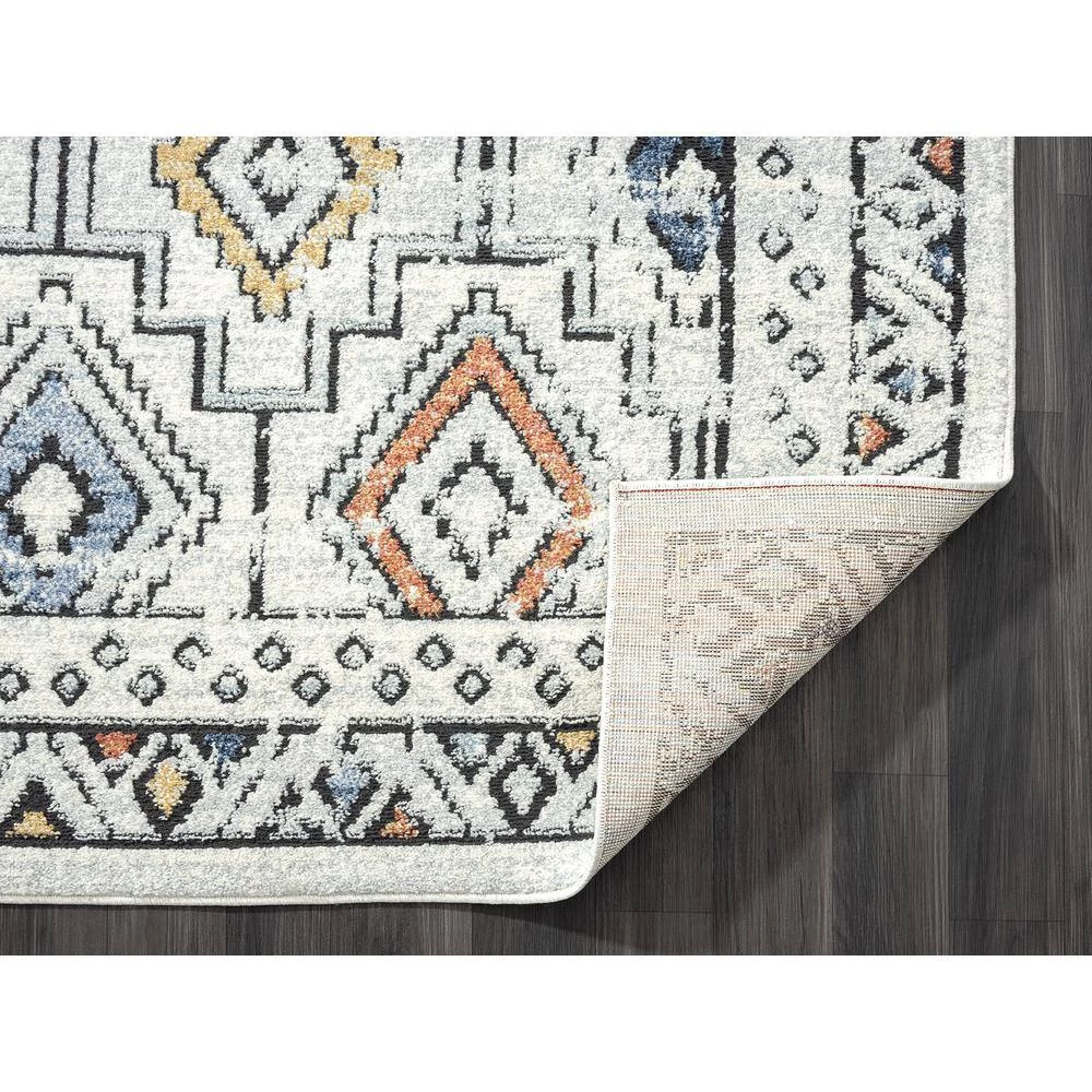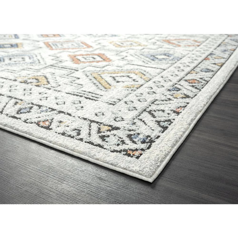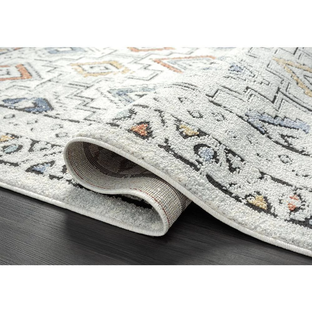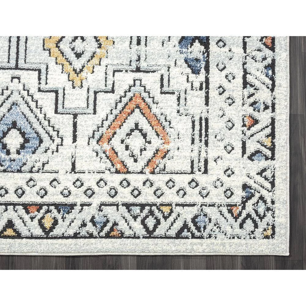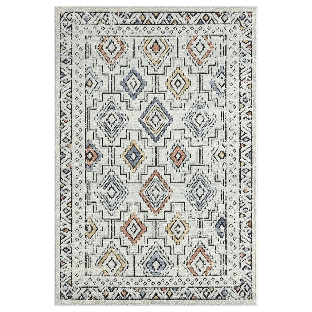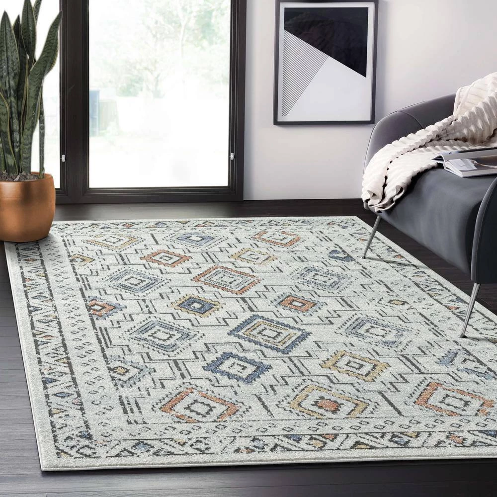 The Venus collection also offers a tribal design in the soft color hues of blues, greys, oranges. This classic rug pattern with multi colored geometric diamonds in the middle with an intricate border creates a more transitional design. A rug that can elevate not only a living room or family room but also a kid’s room or large entryway. The colors on this rug have the washed out effect allowing the rug to blend fluidly with the rest of your decor.