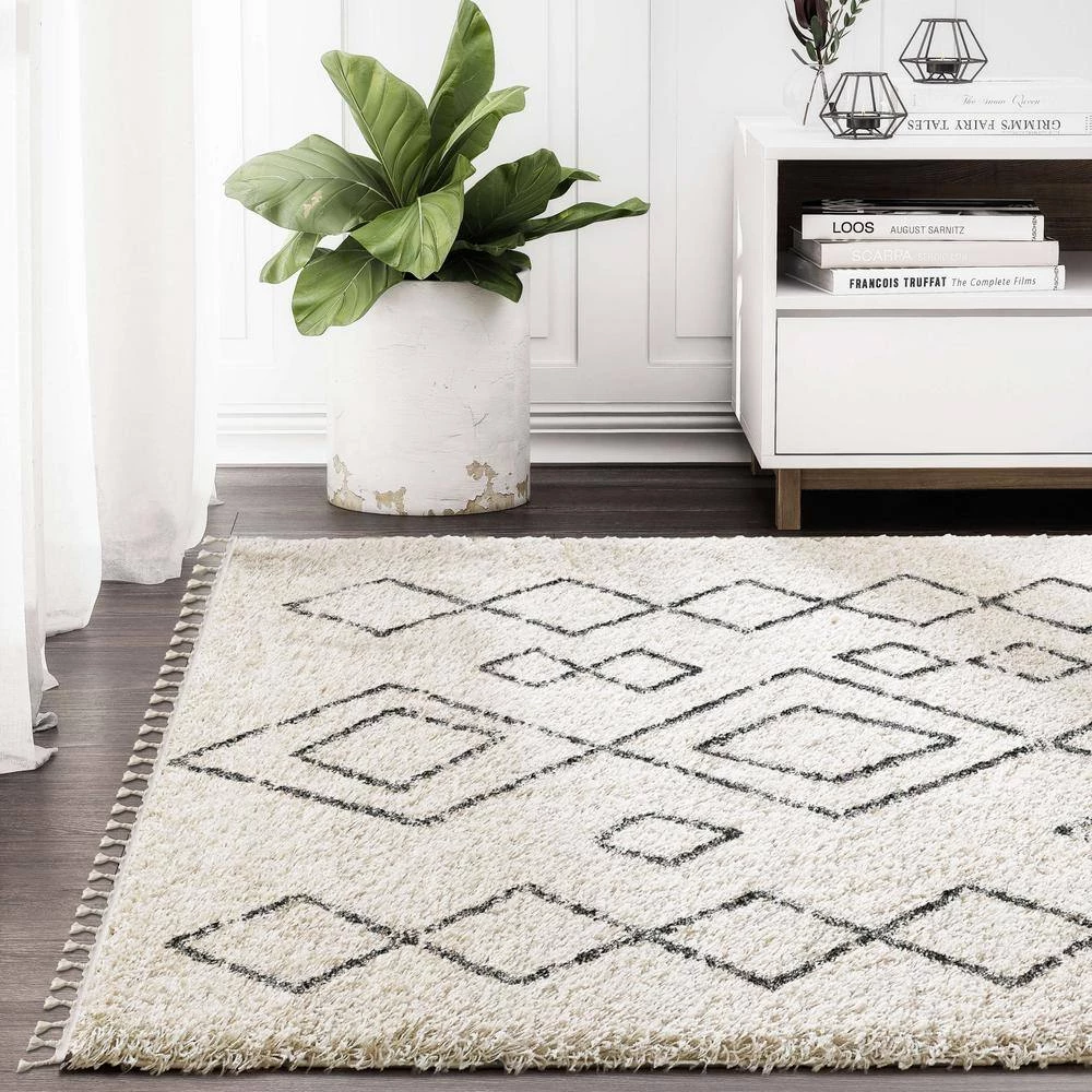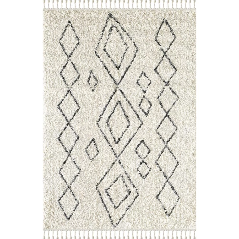 Drawing on traditions from Morcoccan tribes, this Willow Moroccan diamond print area rug is modern enough to match any interior design style. The contemporary colors of ivory and grey match today’s modern aesthetics, blurring the lines between the old and new worlds of style. While this is a subtle interlocked diamond pattern, it’s just abstract enough to draw your interest. This design is far from simple, so it will add its own unique touch to any room in your home. The rich shag pile adds a softness to the bold geometric lines, toning down this area rug into its own work of art.